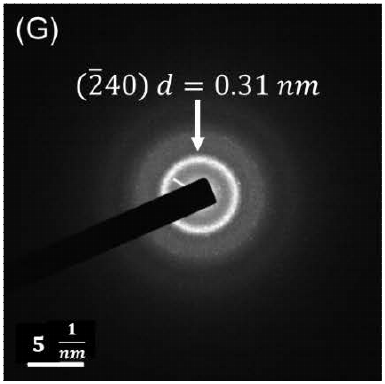圖F為一個典型的砂磨后的Ta-LLZO顆粒的STEM照片。經(jīng)過砂磨的細(xì)顆粒表面較為粗糙,對其中白色虛線框標(biāo)記的區(qū)域做選區(qū)電子衍射(SAED),結(jié)果如圖G所示。電子衍射花樣為展寬明顯的多晶德拜環(huán),最亮的環(huán)對應(yīng)于晶面間距為0.31nm的(240)面。該面間距比純Ta-LLZO粉體和H+交換后的Ta-LLZO晶格中的數(shù)值大。說明砂磨后的細(xì)Ta-LLZO顆粒表面和內(nèi)部晶格變形并多晶化。圖H為顆粒表面的HRTEM原子排列圖像。該圖像表明,Ta-LLZO在極小的疇區(qū)內(nèi)(1~2nm)有序排列,但不同疇區(qū)的排列完全是無序的,進(jìn)一步證實(shí)了砂磨顆粒的多晶化,利于后續(xù)燒結(jié)。